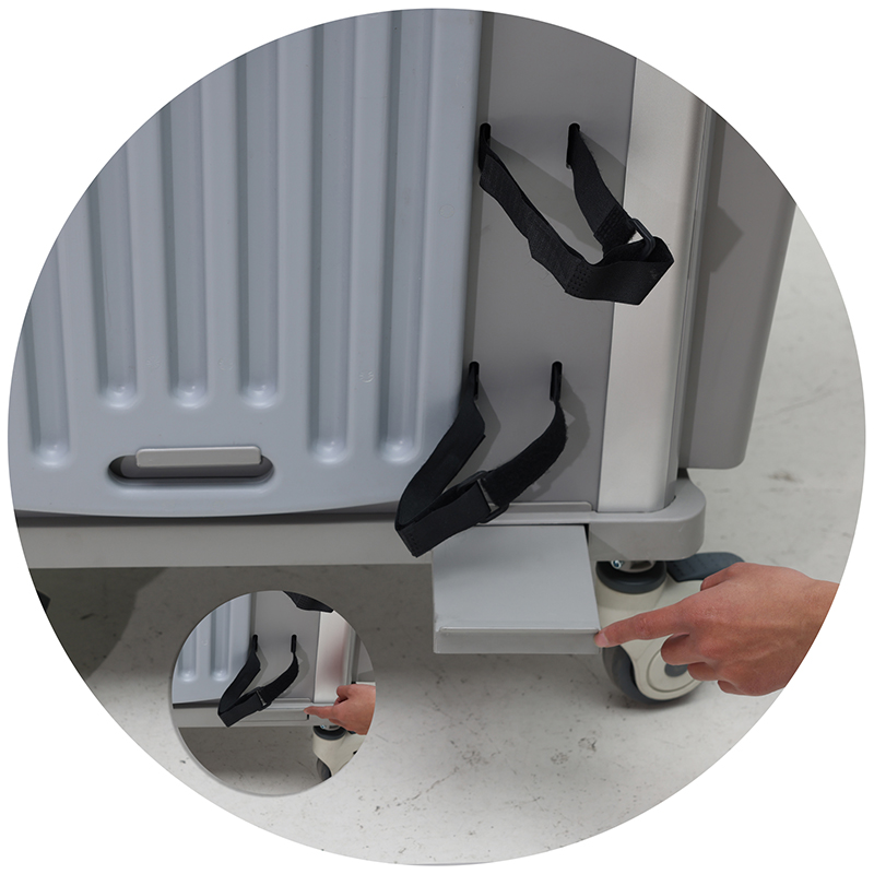 Avec poteau IV réglable en hauteur caché, 2 boîtes de pointes de 2L dans le panier, 2 poubelles de 2 couleurs.